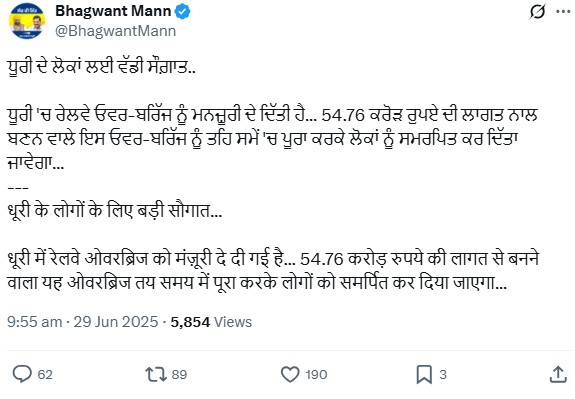 ਸੀਐਮ ਮਾਨ ਨੇ ਇਸ ਬਾਰੇ ਜਾਣਕਾਰੀ ਸੋਸ਼ਲ ਮੀਡੀਆ ਪਲੇਟਫ਼ਾਰਮ ਐਕਸ (ਪਹਿਲਾਂ ਟਵਿੱਟਰ) ‘ਤੇ ਸਾਂਝੀ ਕੀਤੀ। ਉਨ੍ਹਾਂ ਕਿਹਾ ਕਿ 54.76 ਕਰੋੜ ਰੁਪਏ ਦੀ ਲਾਗਤ ਨਾਲ ਬਣ ਰਿਹਾ ਇਹ ਓਵਰਬ੍ਰਿਜ ਨਿਰਧਾਰਤ ਸਮੇਂ ਦੇ ਅੰਦਰ ਪੂਰਾ ਹੋ ਜਾਵੇਗਾ।  ਇਹ ਪ੍ਰੋਜੈਕਟ ਇਲਾਕੇ ਦੀ ਇੱਕ ਲੱਖ ਤੋਂ ਵੱਧ ਆਬਾਦੀ ਨੂੰ ਆਸਾਨ ਆਵਾਜਾਈ ਪ੍ਰਦਾਨ ਕਰੇਗਾ।