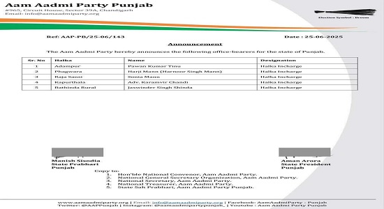 ਜਲੰਧਰ : ਆਮ ਆਦਮੀ ਪਾਰਟੀ ਪੰਜਾਬ ਦੇ ਮੁਖੀ ਅਮਨ ਅਰੋੜਾ ਅਤੇ ਸੂਬਾ ਇੰਚਾਰਜ ਮਨੀਸ਼ ਸਿਸੋਦੀਆ ਨੇ ਪੰਜਾਬ ਦੇ 5 ਹਲਕਿਆਂ ਵਿੱਚ ਇੰਚਾਰਜ ਨਿਯੁਕਤ ਕੀਤੇ ਹਨ। ਜਾਣਕਾਰੀ ਅਨੁਸਾਰ, ਆਦਮਪੁਰ, ਫਗਵਾੜਾ, ਰਾਜਾ ਸਾਂਸੀ, ਕਪੂਰਥਲਾ ਅਤੇ ਬਠਿੰਡਾ ਦਿਹਾਤੀ ਵਿੱਚ ਹਲਕਾ ਇੰਚਾਰਜ ਨਿਯੁਕਤ ਕੀਤੇ ਗਏ ਹਨ। ਇਸ ਲਈ, ਜਿਨ੍ਹਾਂ ਆਗੂਆਂ ਨੂੰ ਇਹ ਮਹੱਤਵਪੂਰਨ ਜ਼ਿੰਮੇਵਾਰੀਆਂ ਸੌਂਪੀਆਂ ਗਈਆਂ ਹਨ, ਉਨ੍ਹਾਂ ਦੇ ਨਾਵਾਂ ਦੀ ਸੂਚੀ ਹੇਠਾਂ ਦਿੱਤੀ ਗਈ ਹੈ।